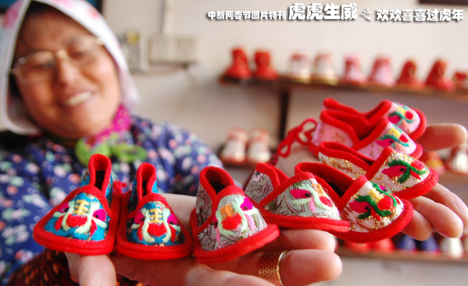 元旦佳節(jié),蘇州周莊風(fēng)景區(qū)內(nèi)的文化街市上“迷你”虎鞋俏銷;⒛甑搅嗽诮系貐^(qū)民間有著“虎年到送虎鞋”的傳統(tǒng)習(xí)俗,集市上造型別致的“虎頭鞋”格外受到游客和市民們的青睞。 中新社發(fā) 蘇民 攝