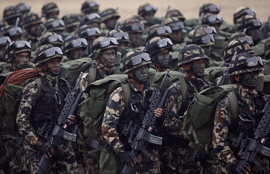 當地時間2月12日,尼泊爾士兵在首都加德滿都舉行了建軍節閱兵式。尼泊爾總統和總參謀長檢閱了受閱部隊。圖片來源:中國新聞網