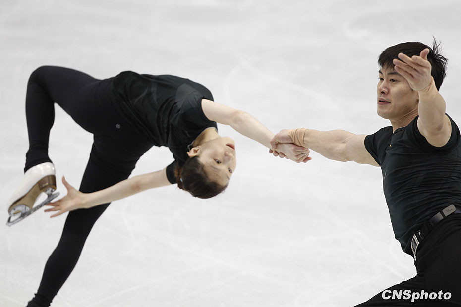 當地時間2月13日,中國花樣滑冰隊龐清/佟健、張丹/張昊在溫哥華太平洋體育館,利用最后的休息時間重復練習積極備戰即將到來的比賽。中新社記者 盛佳鵬 攝