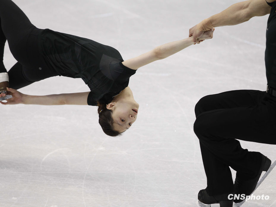 當地時間2月13日,中國花樣滑冰隊龐清/佟健、張丹/張昊在溫哥華太平洋體育館,利用最后的休息時間重復練習積極備戰即將到來的比賽。中新社記者 盛佳鵬 攝