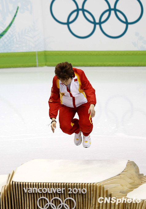 2010年溫哥華冬奧會短道速滑女子500米決賽北京時間2月18日上午11時許舉行,中國選手王濛獲得冠軍,成為中國冬奧歷史上第一位成功衛冕的冠軍,中國隊也實現了這個項目的冬奧三連冠。圖為王濛“飛”上領獎臺。中新社發 盛佳鵬 攝 圖片來源:中國新聞網