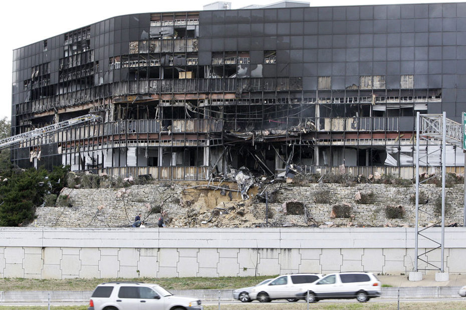 撞機事件導致大樓一面的幾十扇窗戶粉碎,一些樓層天花板塌陷,通過電視畫面,可以看到大樓二三樓層濃煙滾滾,黑煙中不時有竄出的火焰。