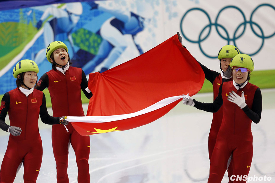 當地時間2月24日,溫哥華冬奧會女子短道速滑3000米接力A組決賽中,中國隊王濛、周洋、孫琳琳、張會四朵金花聯袂出擊,最終將金牌歸入中國隊囊中。圖片來源:中國新聞網
