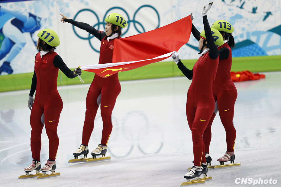 當地時間2月24日,溫哥華冬奧會女子短道速滑3000米接力A組決賽中,中國隊王濛、周洋、孫琳琳、張會四朵金花聯袂出擊,最終將金牌歸入中國隊囊中。圖片來源:中國新聞網