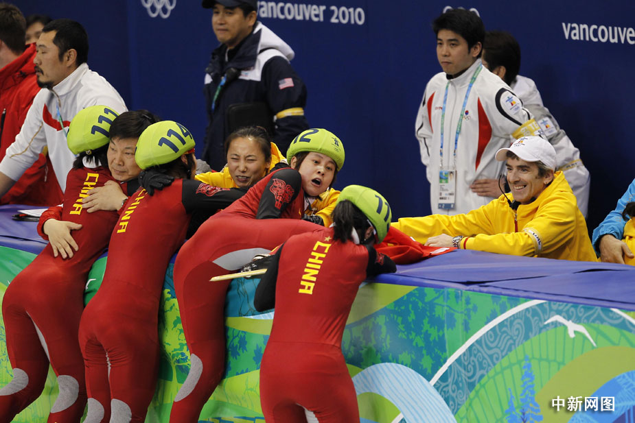 在裁判宣布韓國隊犯規后,一直等候著最終結果的中國姑娘忘情地撲向教練席。圖片清楚地顯示,興奮的王濛撲到教練李琰前面寬寬的防護墊上,她的右腿無意間高高抬起,冰刀刮到了跟在她身后的張會的下巴。王濛意識到自己闖了禍,馬上關切地回頭察看張會的傷情。四位姑娘舉著國旗慶祝勝利時,張會用手捂著她的下巴,漸漸地鮮血浸濕了她的手套。