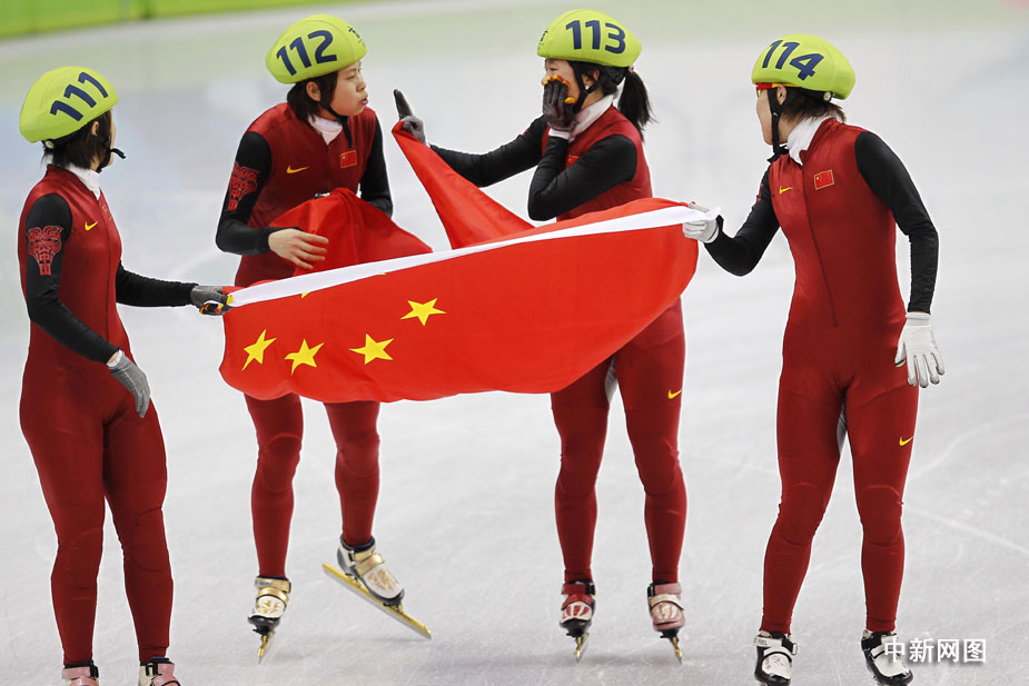 中國短道速滑隊25日在溫哥華冬奧會上奪得女子接力金牌,實現了歷史性突破。中新社記者盛佳鵬 攝