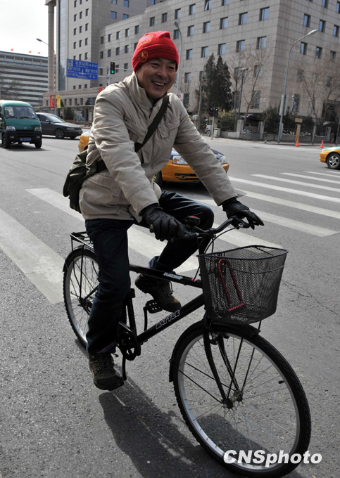 3月2日中午,全國政協委員濮存昕騎自行車去北京國際飯店,向十一屆政協三次會議會務組報到。中新社發 賈國榮 攝