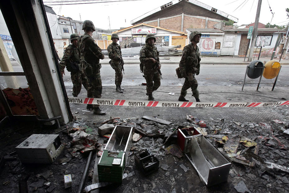 3月2日,智利軍警在街頭維持秩序。智利總統巴切萊特當日說,政府派往災區維持治安的軍人數量已達14000人,地震重災區的搶劫現象已得到控制。圖片來源:中國新聞網