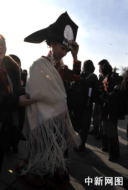 十一屆全國人大三次會(huì)議3月5日在北京開幕,各民族人大女代表的服飾靚麗多彩,在天安門廣場(chǎng)前大展英姿。 中新社記者 賈國榮 攝
