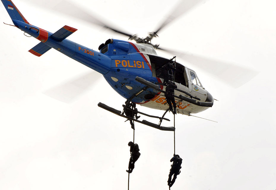 3月13日,印尼警方在首都雅加達的證券交易所舉行了一場反恐演習,為本月底即將到訪印尼的美國總統奧巴馬創造安全的環境。圖片來源:中國新聞網