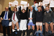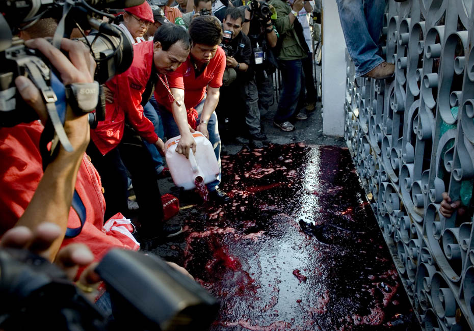 泰國反政府組織“紅衫軍”成員將血液潑灑在曼谷總理府門前,以此向政府施壓要求解散國會下議院。圖片來源:中國新聞網