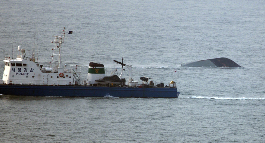 首爾當地時間26日晚9點45分許,在韓國西部海域執行警戒任務的天安艦(1200噸級)因不明原因事故,船底被炸開洞,船尾開始下沉。天安艦上共有104人,韓國巡邏艇和直升飛機迅速展開救援行動,事發5小時后,官員稱已救出58人,但因為強風和夜幕,救援行動進展緩慢,其它人員仍下落不明。圖為一艘救援船靠近幾近沉沒的韓國海軍“天安艦”。