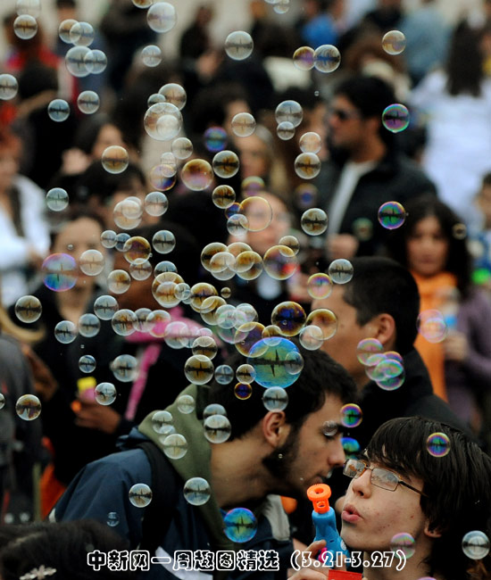 3月21日,在意大利羅馬城中的波波洛廣場,參加“快閃”族聚會的人們吹泡泡迎接春天的到來。圖片來源:中國新聞網(wǎng)>>點(diǎn)擊觀看詳細(xì)內(nèi)容