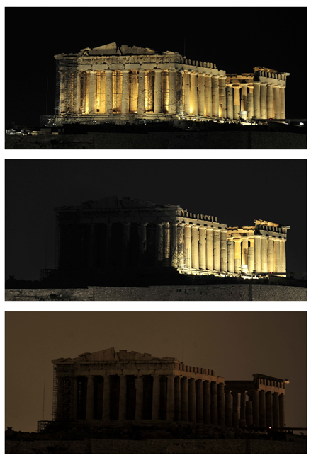 由世界自然基金會發起的“地球一小時”環;顒27日20點30分按照時區依次在全球數千個城市展開。圖為希臘帕特農神廟在熄燈前和熄燈后的景色。