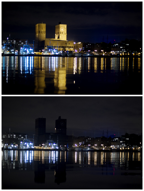 由世界自然基金會發起的“地球一小時”環;顒27日20點30分按照時區依次在全球數千個城市展開。圖為挪威奧斯陸市政廳在熄燈前和熄燈后的景色。
