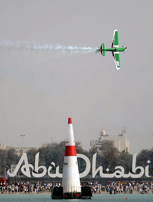 近日,紅牛飛行系列賽世界錦標(biāo)賽預(yù)選賽在阿拉伯聯(lián)合酋長(zhǎng)國阿布扎比舉行。參加比賽飛行員不但要有高速的駕駛技術(shù),還要有勇往直前的膽量。圖片來源:中國新聞網(wǎng)