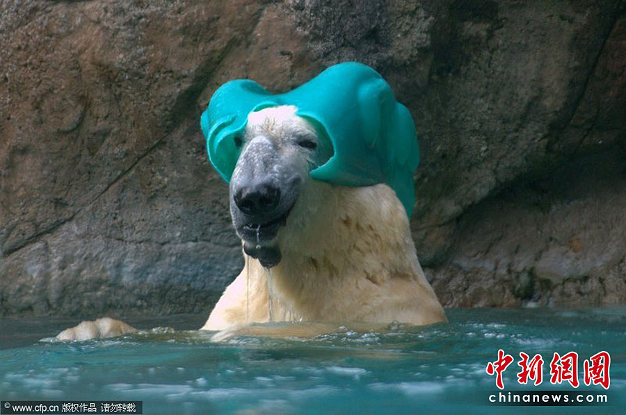 美國Asheboro北卡羅來納動物園一頭名叫威利的北極熊可是個“活寶”。任何一個可用的東西都能成為它在鏡頭前“耍寶”的玩具。圖片來源:CFP