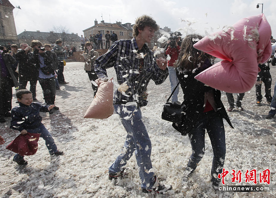 4月3日是國際“枕頭大戰”日。在這一天,多個國家的“枕頭大戰”愛好者相約走上街頭,用獨特的方式來慶祝他們的節日。圖片來源:中國新聞網