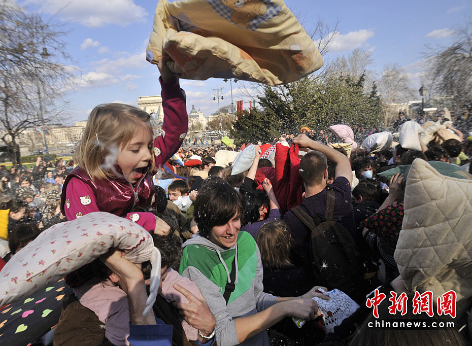 4月3日是國(guó)際“枕頭大戰(zhàn)”日。在這一天,多個(gè)國(guó)家的“枕頭大戰(zhàn)”愛(ài)好者相約走上街頭,用獨(dú)特的方式來(lái)慶祝他們的節(jié)日。圖片來(lái)源:中國(guó)新聞網(wǎng)