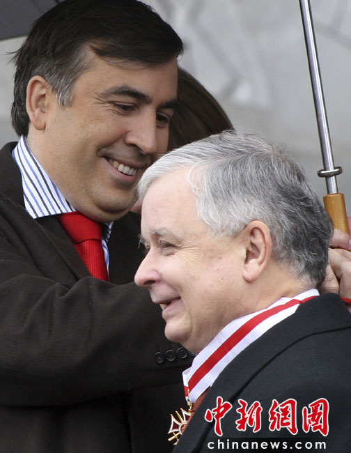 波蘭總統卡欽斯基乘坐的一架圖-154飛機10日在俄羅斯斯摩棱斯克州北部一軍用機場降落時失事,至少87人死亡。卡欽斯基本人被確認身亡。圖為2007年波蘭總統卡欽斯基與格魯吉亞總統米哈伊爾薩卡什維利。
