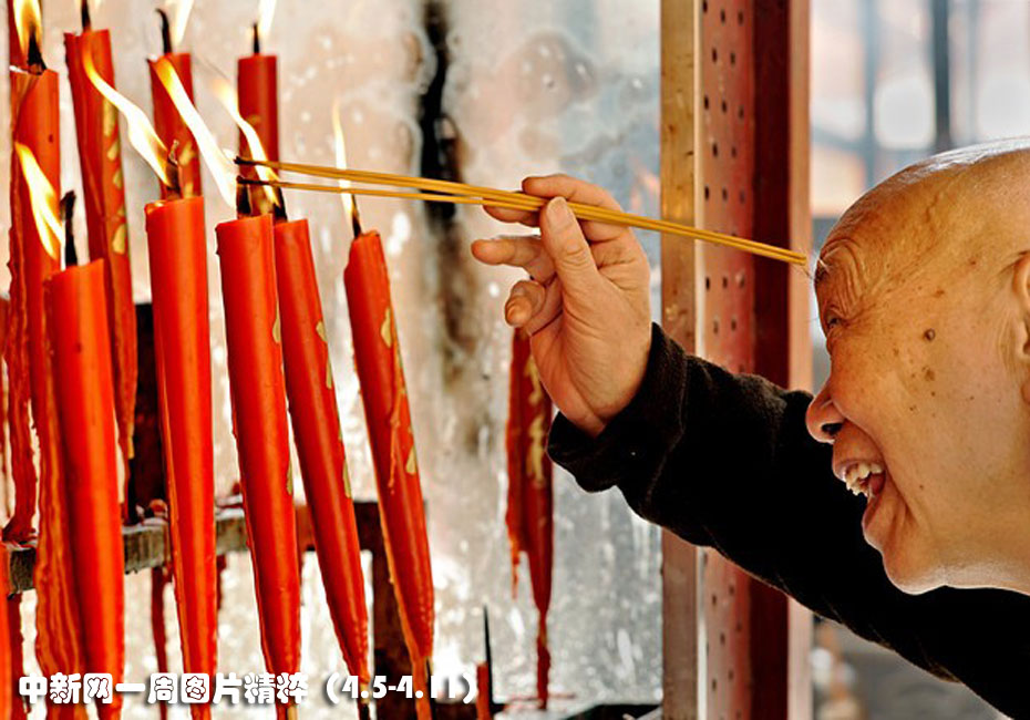 每年清明節時,中國人會去墓地和寺廟焚香燒紙來表示對祖先的敬意。照片攝于4月5日周一,圖中這位上海老人正在寺廟里燒香祭祖。