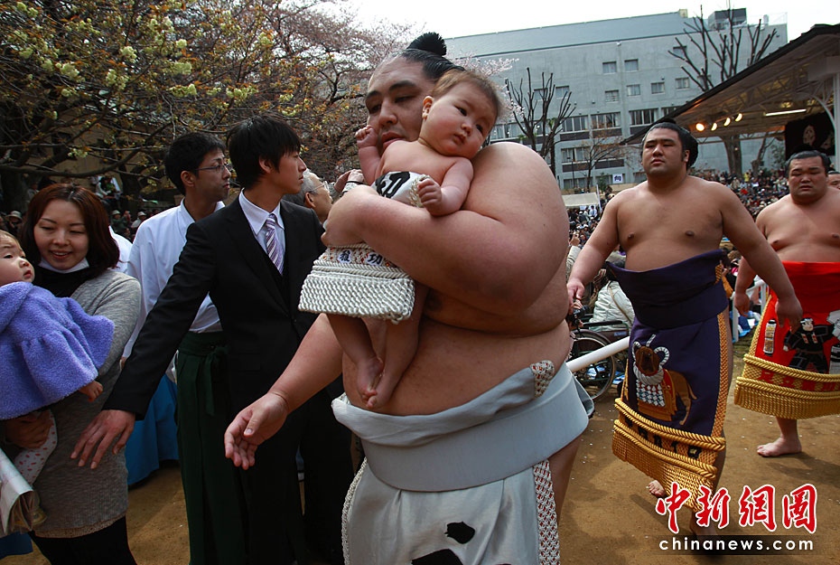 4月9日,來自世界各地的相撲選手齊聚日本東京靖國神社內的相撲館參加為期一天的日本供奉大相撲比賽。圖片來源:中國新聞網