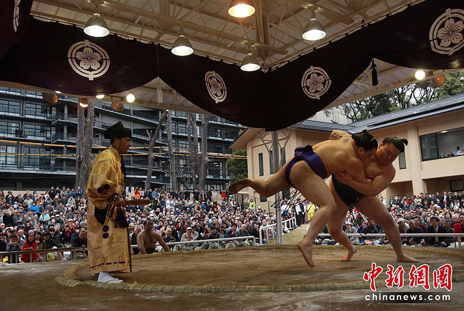 4月9日,來自世界各地的相撲選手齊聚日本東京靖國神社內的相撲館參加為期一天的日本供奉大相撲比賽。圖片來源:中國新聞網