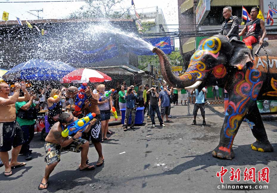 4月12日,泰國迎來一年一度的潑水節(jié),在拷桑路旅游區(qū)人們用水槍與大象“互噴”希望為對方送上祝福同時慶祝泰國新年。圖片來源:中國新聞網(wǎng)