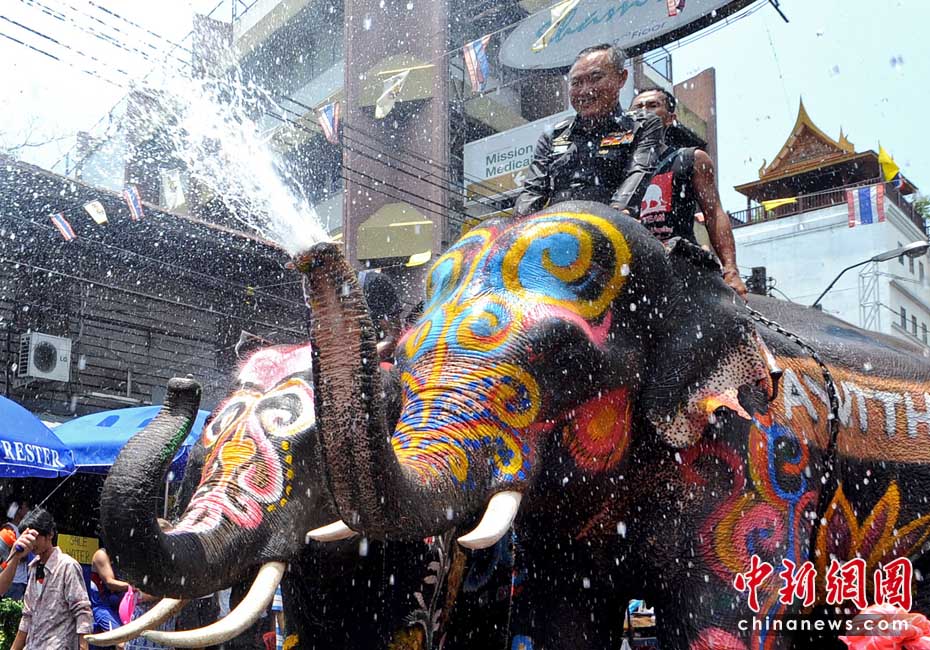 4月12日,泰國迎來一年一度的潑水節,在拷桑路旅游區人們用水槍與大象“互噴”希望為對方送上祝福同時慶祝泰國新年。圖片來源:中國新聞網