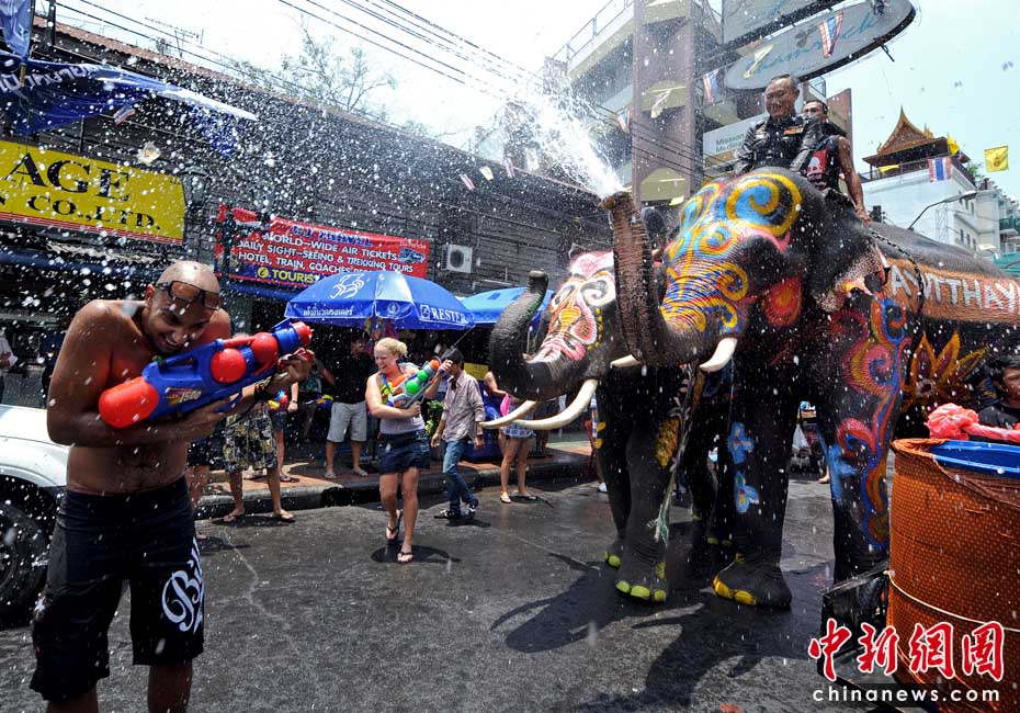 4月12日,泰國迎來一年一度的潑水節,在拷桑路旅游區人們用水槍與大象“互噴”希望為對方送上祝福同時慶祝泰國新年。圖片來源:中國新聞網