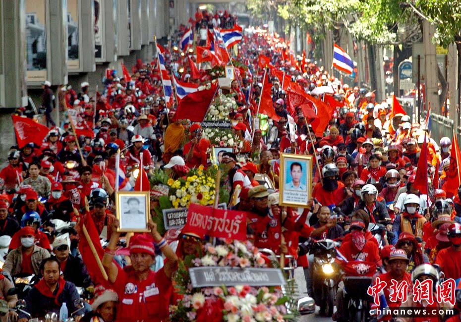 當地時間4月12日,泰國紅衫軍在曼谷市區抬著棺材舉行游行,借此向政府施壓促阿披實下臺。此前紅衫軍示威者與軍警發生沖突,造成21人死亡。圖片來源:中國新聞網