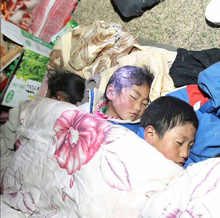圖為4月14日深夜,幾名受災兒童在露天睡覺,他們的父母正在旁邊搭建帳篷。圖片來源:新華網(wǎng) 丁林攝