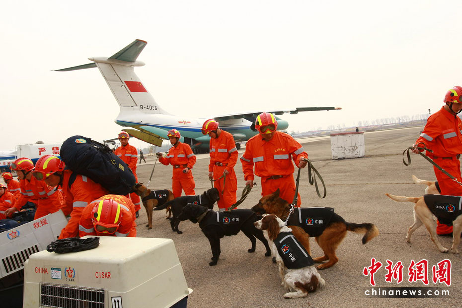 圖為4月14日下午,中國國際地震救援隊攜帶重型搜救設備搭乘空軍專機趕赴青海玉樹震區。中新社發 譚超 攝
