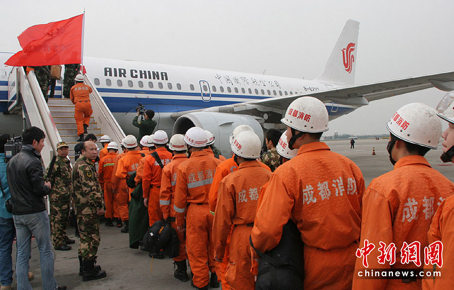 圖為4月14日18時(shí)02分和18時(shí)08分,國(guó)航西南分公司執(zhí)行緊急救援包機(jī)的一架空中客車(chē)A319和一架波音757飛機(jī)共搭載302名消防救災(zāi)人員和搜救設(shè)備從成都雙流機(jī)場(chǎng)起飛,火速趕往西寧,將前往青海玉樹(shù)7.1級(jí)地震震區(qū)救援。中新社發(fā) 易世忠 攝