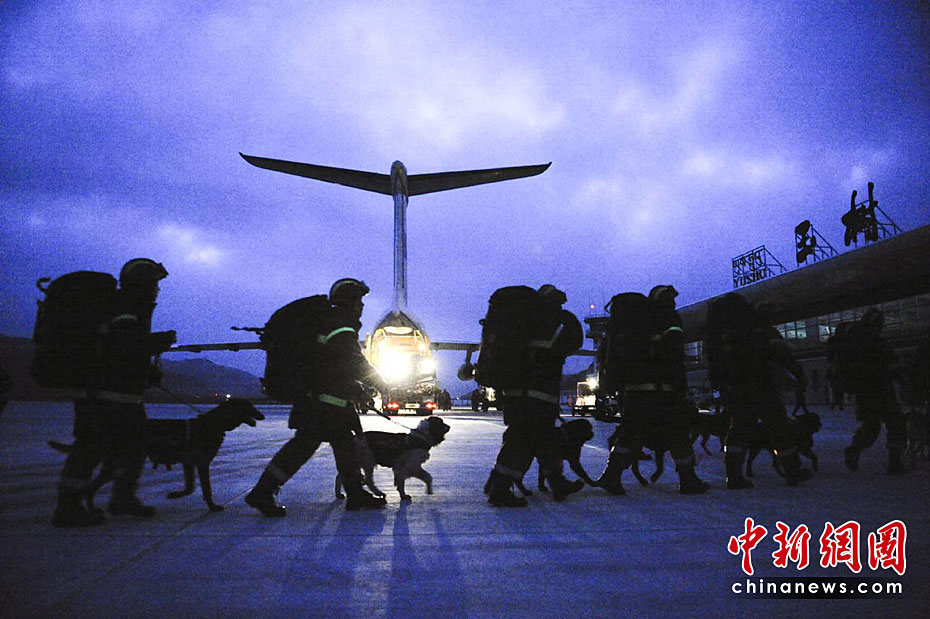 圖為4月14日20點20分,中國國際地震救援隊抵達玉樹機場。中新社發 廖攀 攝