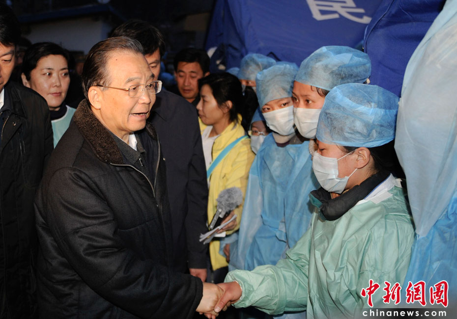 4月15日20時,中國國務院總理溫家寶來到青海省玉樹縣玉樹自治州醫院看望受災民眾和醫務人員。中新社發 廖攀 攝