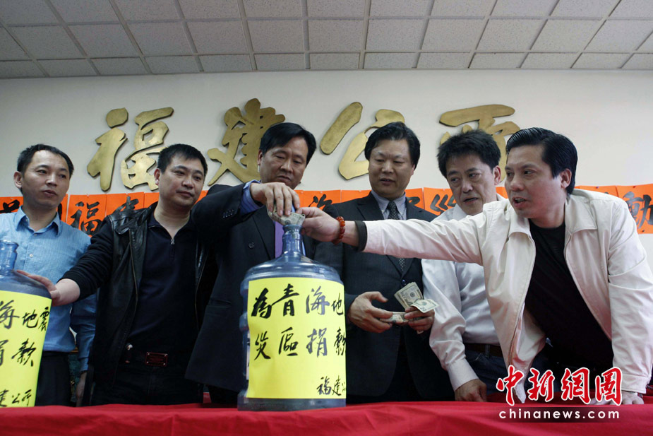 青海玉樹發(fā)生地震以來,美國各地的華人華僑齊伸援手,紐約的華人社團聯(lián)合總會15日呼吁下屬數(shù)百社團為玉樹災(zāi)區(qū)捐款,并在華埠主要街道沿街設(shè)立捐款箱。圖為紐約福建公所捐款現(xiàn)場,華人華僑們在不到幾分鐘的時間內(nèi),就為青海玉樹災(zāi)區(qū)捐款近5000美元。中新社發(fā) 魏晞 攝