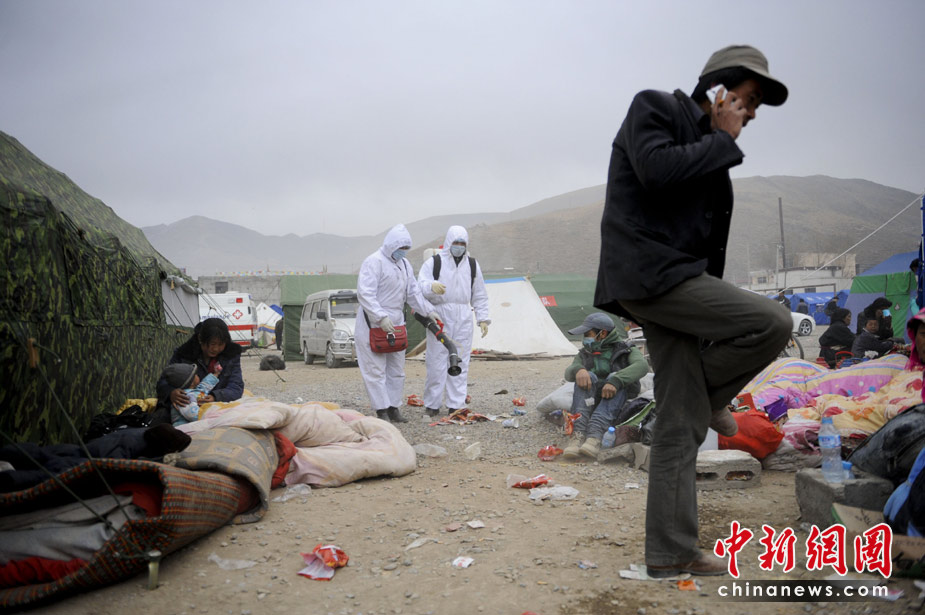 4月16日,青海玉樹(shù)體育場(chǎng)地震災(zāi)民安置點(diǎn),青海疾控中心展開(kāi)防疫消毒工作。中新社發(fā) 廖攀 攝