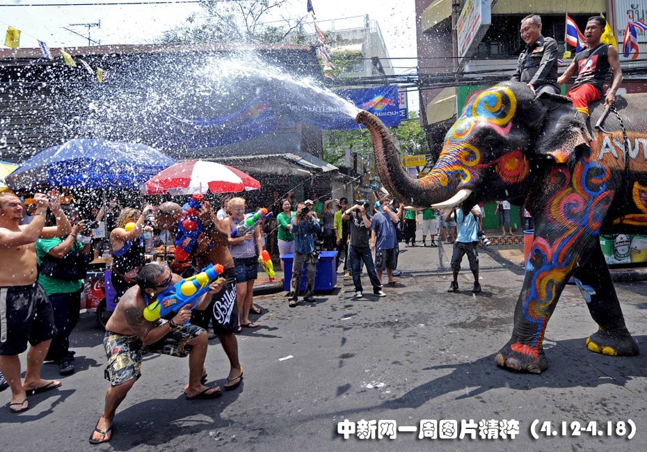 4月12日周一的泰國曼谷,一只大象在街頭向游人噴水。周二泰國將迎來一年一度的潑水節,這是慶祝泰國新年的節日。