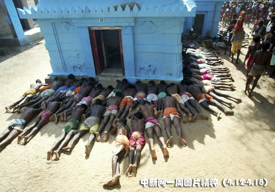 4月14日周三,印度村民拜倒在一個印度教寺廟前。