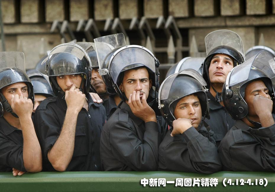 4月13日周二,埃及開羅市中心一支安全部隊(duì)封鎖示威者。