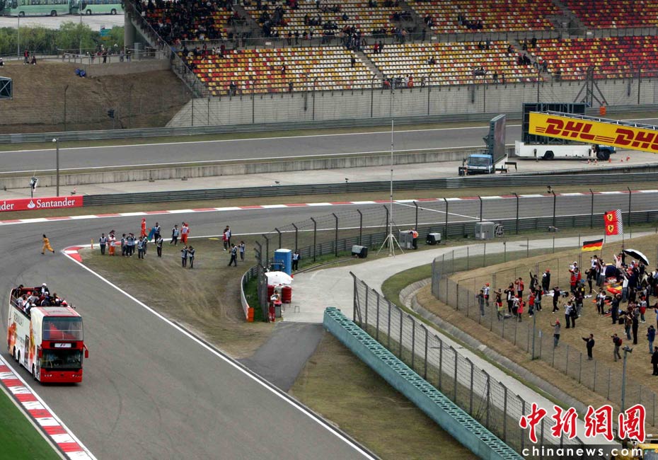 4月18日下午,2010國際汽聯F1世界錦標賽上海站在上海國際賽車場舉行正式比賽,賽前24名參賽車手按照慣例乘坐敞篷車環繞賽場一周與車迷見面,但是寥寥無幾的觀眾與陰沉的天氣使上海F1賽事創下開賽七年以來觀眾人數最低的紀錄。中新社記者 任晨鳴 攝