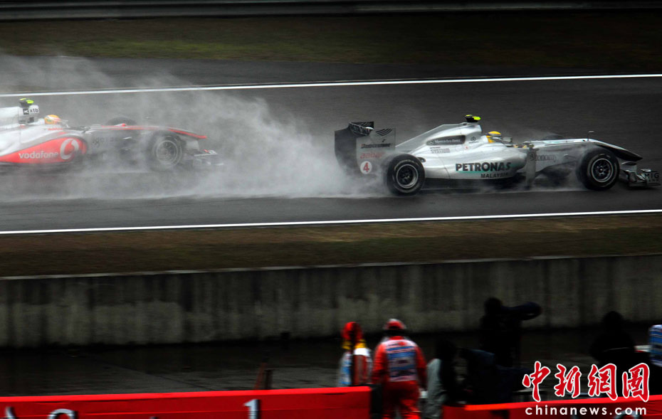圖為漢密爾頓雨中超越羅斯伯格。中新社記者 任晨鳴 攝