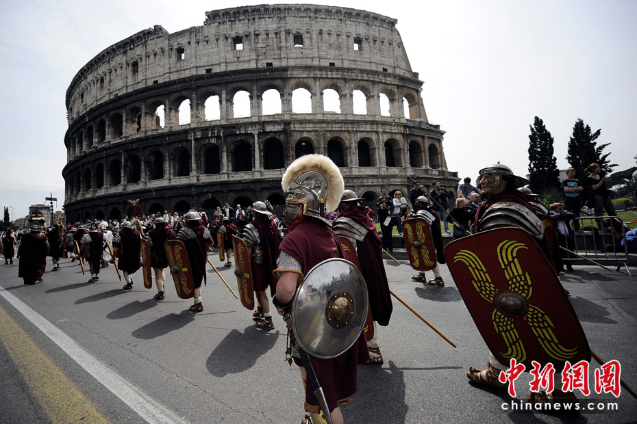 4月18日,意大利羅馬,男子打扮成武士在圓形競技場附近參加游行,慶祝羅馬建城2763周年。圖片來源:中國新聞網