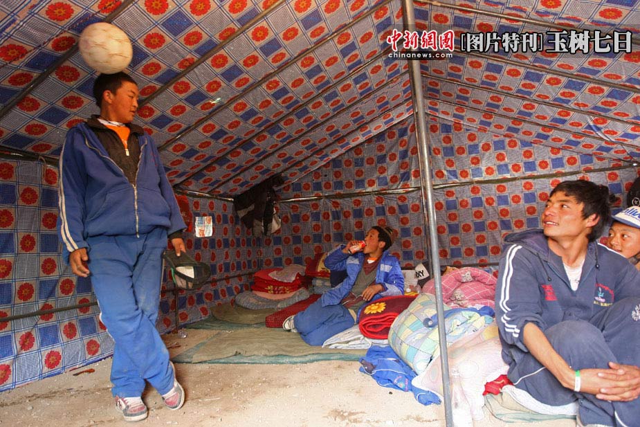 2010年4月19日,青海玉樹(shù)縣結(jié)古鎮(zhèn)玉樹(shù)縣第一民族中學(xué)的學(xué)生宿舍帳篷內(nèi),德尕扎西(左)在其他同學(xué)面前表演球技,稱自己是“C羅”。中新社發(fā) 盛佳鵬 攝