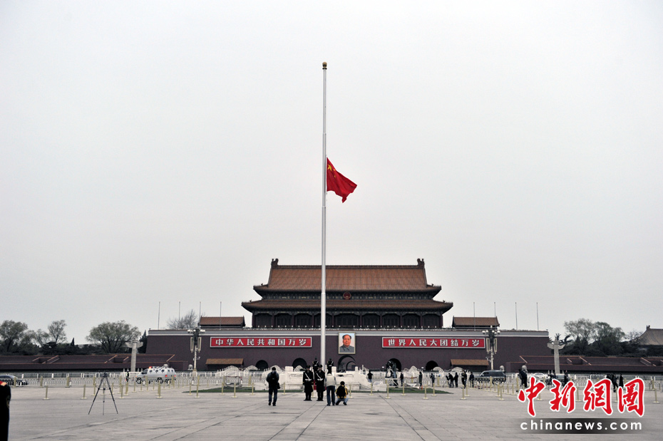 4月21日早晨,北京天安門廣場下半旗向玉樹地震遇難者致哀。中新網記者 金碩 攝