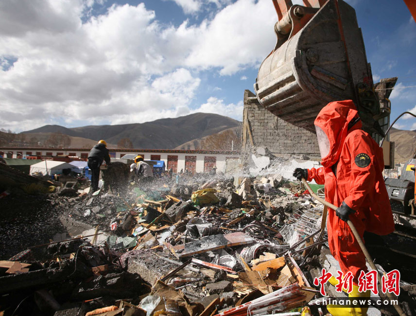 4月20日,來(lái)自四川內(nèi)江軍分區(qū)陸軍預(yù)備役防化團(tuán)開始對(duì)玉樹城區(qū)廢墟展開消毒工作。地震發(fā)生以后衛(wèi)生部門加強(qiáng)對(duì)震區(qū)消毒防疫工作力度,防疫人員開始對(duì)廢墟、災(zāi)民安置區(qū)展開拉網(wǎng)式消毒防疫,重點(diǎn)預(yù)防鼠疫、水質(zhì)污染,確保大災(zāi)之后無(wú)大疫。中新社發(fā) 劉忠俊 攝
