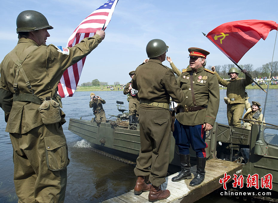 德國當地時間4月24日,演員身著二戰時期美蘇軍裝在德國托爾高南部易北河畔的一座小橋上重現當年的“會師”一幕。