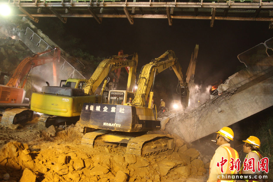 4月25日, 臺灣一條交通要道、“北二高”基隆段發生山崩意外,傾瀉而下的土石壓垮一座高架橋,并覆蓋道路約200米,據傳有人車被埋。圖為工程人員連夜開挖,展開大搜救。 中新社發 董會峰 攝