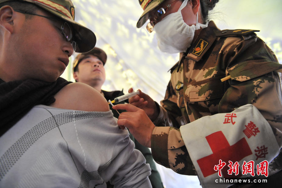 武警青海總隊(duì)醫(yī)院救護(hù)隊(duì)半夜為受傷的士兵補(bǔ)打疫苗。4月下旬的玉樹(shù)地震災(zāi)區(qū)急缺防疫藥品,中新社發(fā) 賈國(guó)榮 攝
